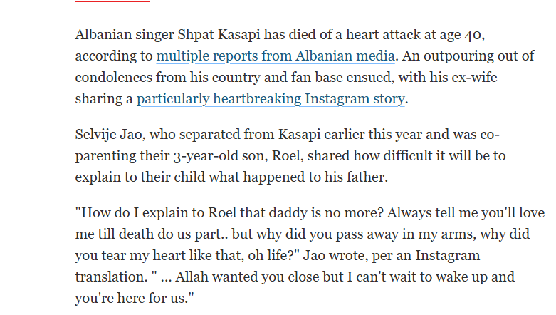 Media të shumta të huaja kanë pasqyruar lajmin e ndarjes nga jeta të këngëtarit shqiptar Shpat Kasapi.