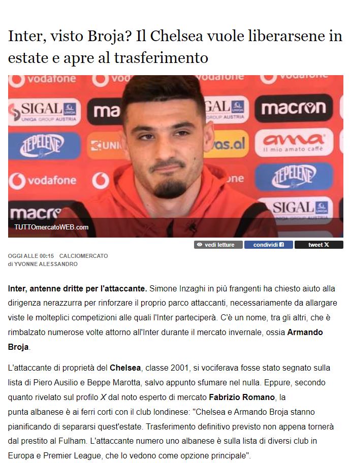 Chelsea dhe Broja po planifikojnë të ndahen përfundimisht në fund të këtij sezoni”, ky ishte lajmi i bërë publik një ditë më parë nga Fabrizio Romano. Sipas gazetarit të njohur, “bomberi” do të rikthehet te Chelsea pas huazimit të dështuar te Fulham gjatë janarit, por rikthimi i tij do të jetë i përkohshëm, pasi blutë nuk e shohin si pjesë të projektit. Ky lajm ka bërë xhiron në mediat italiane pasi për sulmuesin kuqezi ka një interesim të fortë nga shume klube në Serie A. Sipas mediave italiane, janë të paktën tre ekipe “big” që interesohet për shërbimet e Brojës, Inter, Milan dhe Napoli.