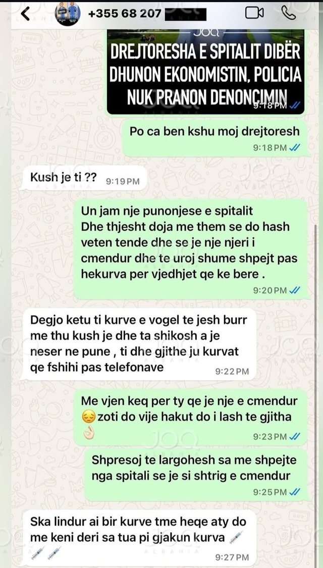 S’ka lindur ai bir k*rve të më heqë, aty do më keni deri sa t’ua pi gjakun k*rva.” – janë mesazhet e Irini Shehut drejtuar punonjëses së spitalit.