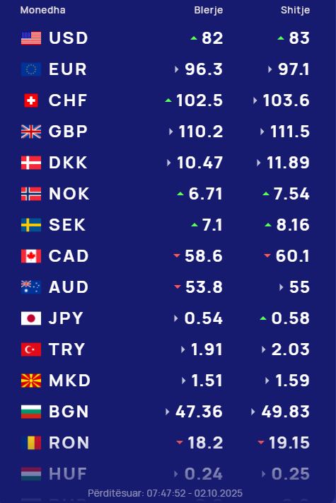 Ndërsa paundi britanik do blihet me 110.2 lekë dhe do shitet me 111.5 lekë.