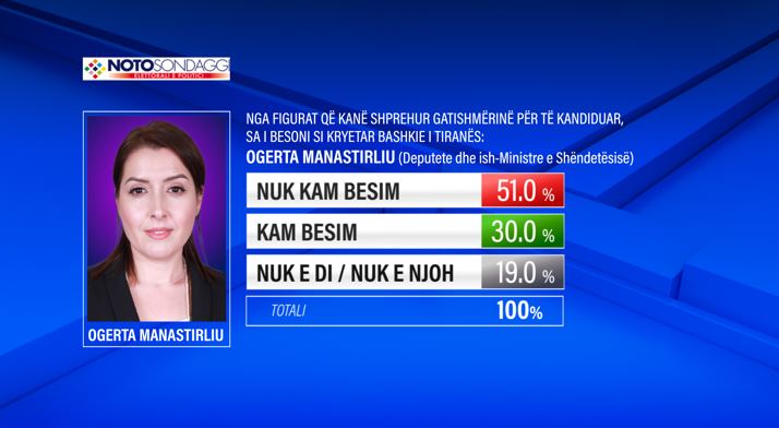 Sipas të dhënave, ish-ministrja e Shëndetësisë Ogerta Manastirliu gëzon nivelin më të lartë të besimit ndër qytetarët e Tiranës.