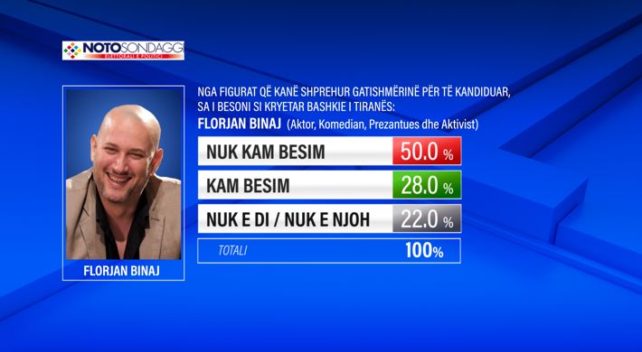 Në vend të dytë për nivel besimi renditet aktori dhe aktivisti Florjan Binaj, me: