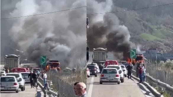 Një autobusi është përfshirë nga flakët në aksin Elbasan-Tiranë.
