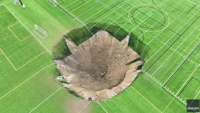 Një gropë që thuhet se është deri në 100 metra e thellë dhe po aq e gjerë, u hap në mes të një fushe futbolli në SHBA, duke “gëlltitur” një shtyllë të madhe ndriçimi.